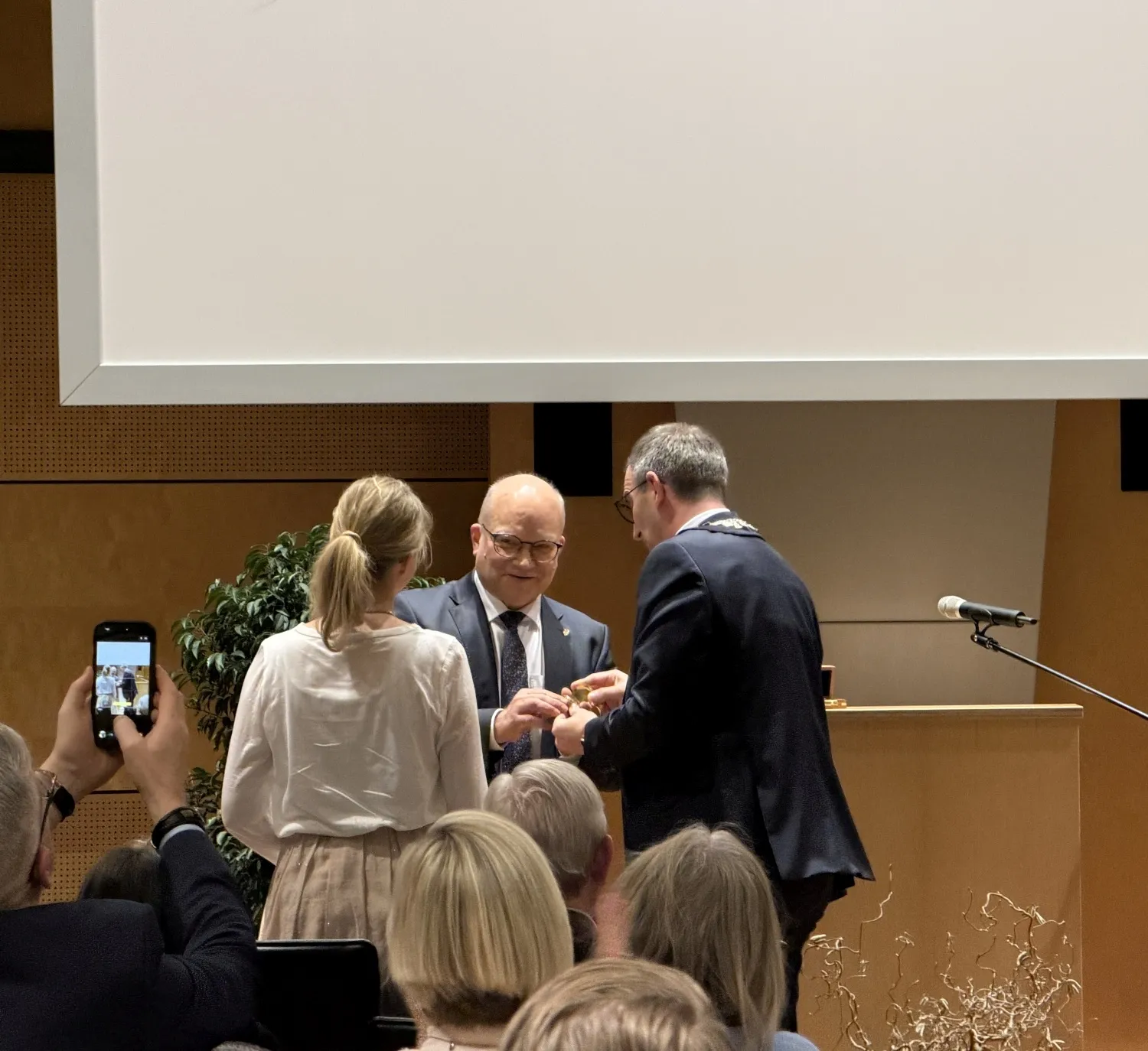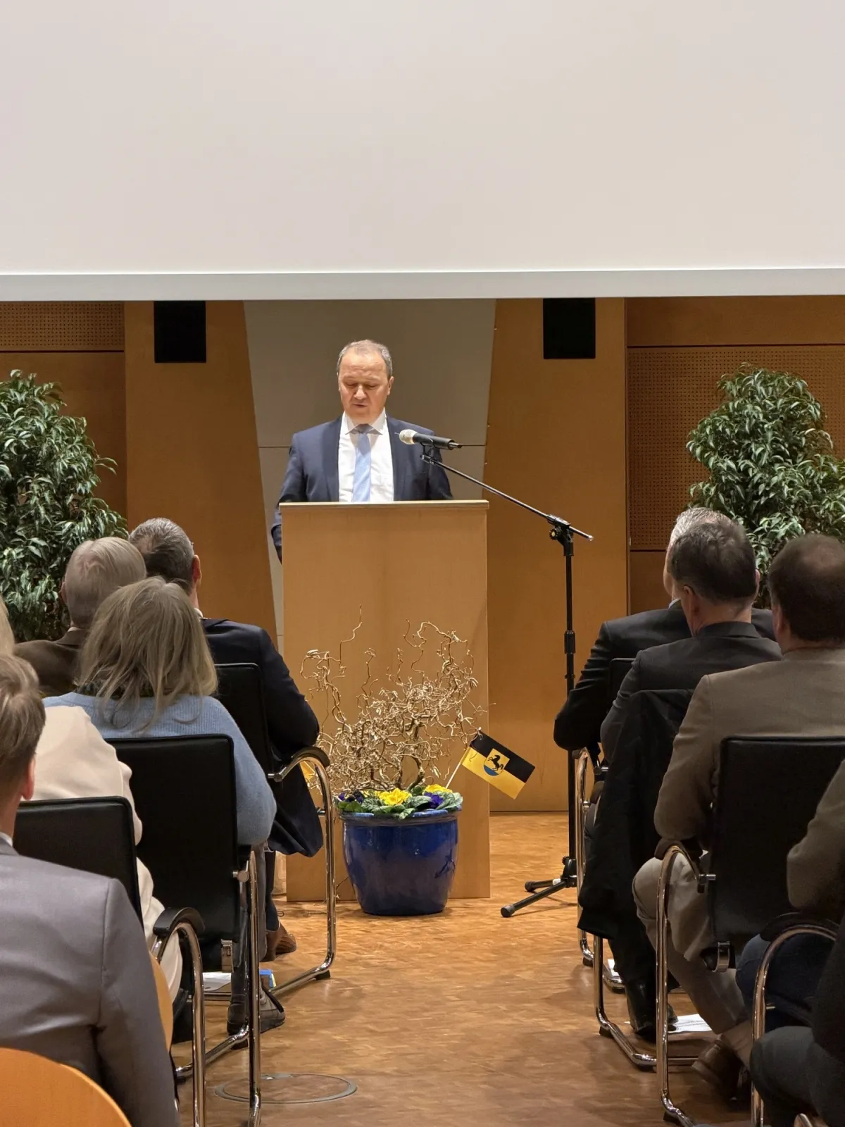 Für den Landkreis Heilbronn überbrachte Landrat Norbert Heuser Grüße. Er freute sich, zahlreiche Bürgermeister aus dem Landkreis, aber auch aus dem benachbarten Neckar-Odenwald-Kreis und dem Rhein-Neckar-Kreis begrüßen zu können. Er betonte, dass es nicht selbstverständlich sei, dass sich jemand findet, der für die 23.000 Einwohner einer Stadt Verantwortung übernehmen wolle. So fänden sich in einigen Orten gar keine Bewerber mehr um das Bürgermeisteramt. Als Präsent für die 2. Amtszeit überbrachte er einen Kompass, der bei der richtigen Orientierung hilft.
