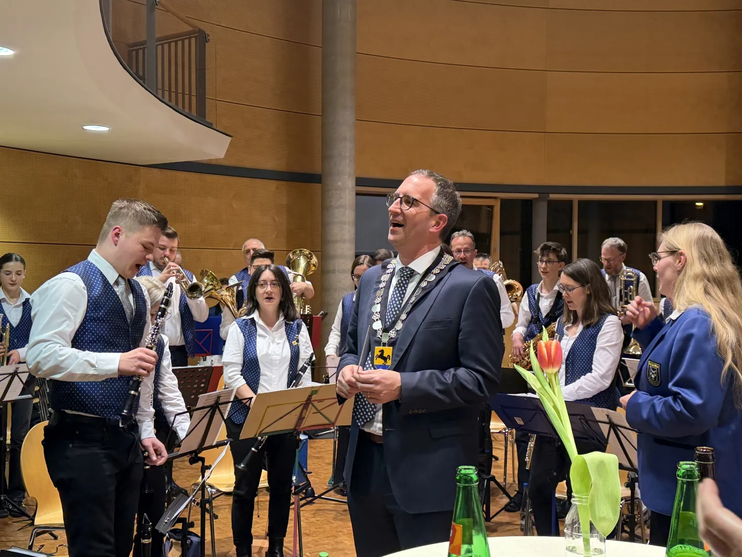 Im Anschluss an die Verpflichtung gab es einen Stehempfang im Foyer, wo die Gäste in guter Stimmung noch lange verweilten. Dazu trug sicher auch die gute Bewirtung durch Kay Nekolny und die musikalische Umrahmung durch den Musikverein Grombach bei. Hier konnte OB Frei auch sein Talent als Dirigent unter Beweis stellen und mit großem Engagement das Badner Lied dirigieren und singen.