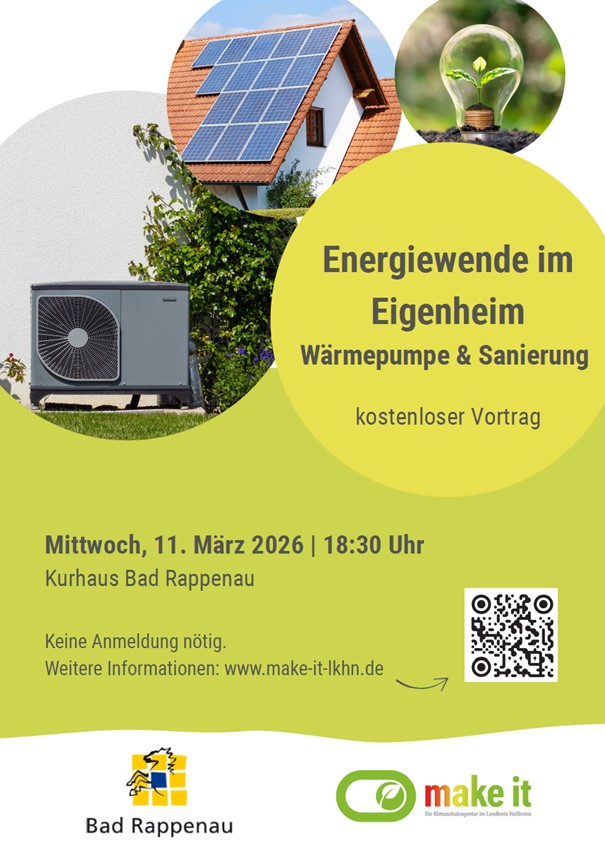 Energieberater und Photovoltaik-Experte Armin Müller-Scheerschmidt von make it Landkreis Heilbronn GmbH, der Klimaschutzagentur des Landkreises Heilbronn, gibt in einem Vortrag am 11. März 2026 einen umfassenden Überblick zum Thema Wärmepumpe. Er informiert über den aktuellen Stand der gesetzlichen Vorgaben, die Funktionsweise und Typen von Wärmepumpen sowie über Kosten, Finanzierungs- und Fördermöglichkeiten. Daneben wird außerdem die Verbesserung von bestehenden Heizungsanlagen thematisiert – schon kleine Maßnahmen können hier nämlich eine große Wirkung entfalten. Der Fokus des Vortrags liegt auf energetischer Sanierung und Heizungstausch.