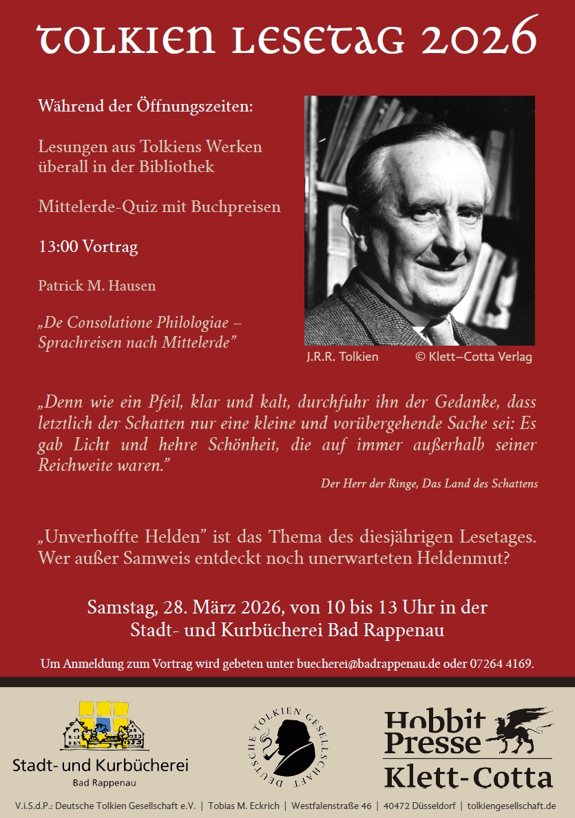 Orks, Elben und Hobbits – wer kennt sie nicht? Am 28. März findet in Kooperation mit dem Stammtisch Baden-Pfalz der Deutschen Tolkien Gesellschaft e. V. der Tolkien Lesetag erstmals auch in der Stadt- und Kurbücherei Bad Rappenau statt.