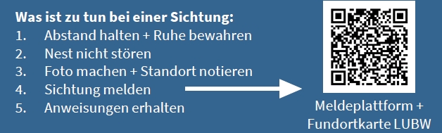 Bei Sichtung der asiatischen Hornisse bzw. Nestern der invasiven Art erfolgt die Meldung über die Plattform der Landesanstalt für Umwelt Baden Württemberg – siehe dazu weitere Informationen auf dem folgenden Info-Flyer: