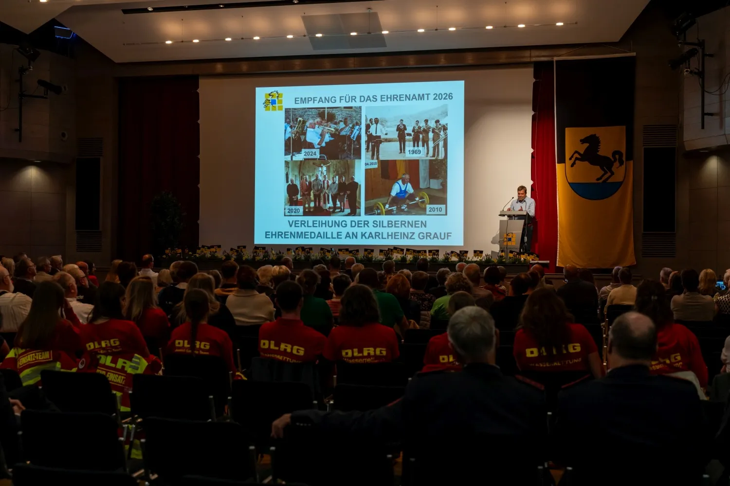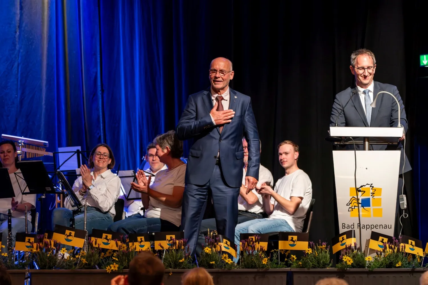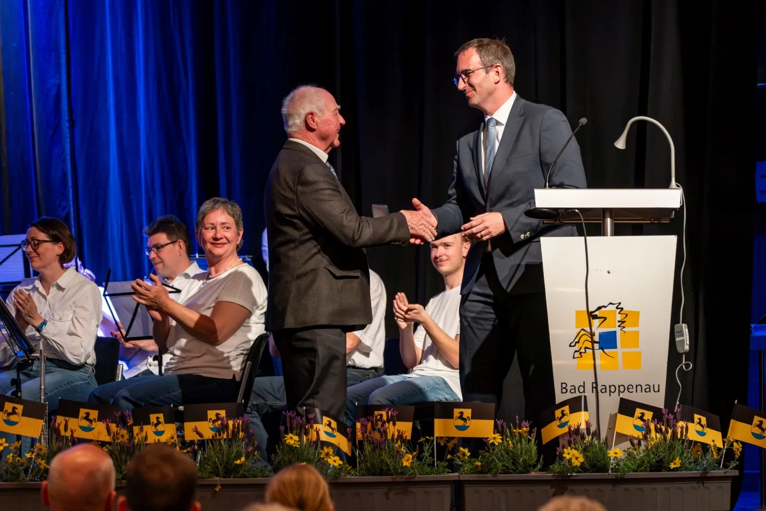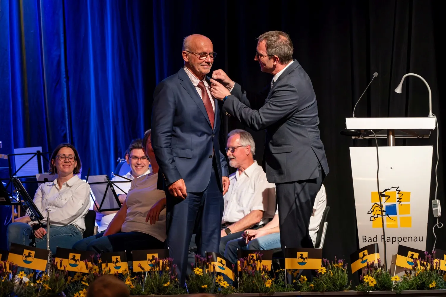 Unter dem Beifall der Anwesenden überreichte anschließend Oberbürgermeister Frei die Ehrennadel des Landes Baden-Württemberg an Kay Schüßler und die Ehrenmedaille der Stadt Bad Rappenau an Karlheinz Grauf.