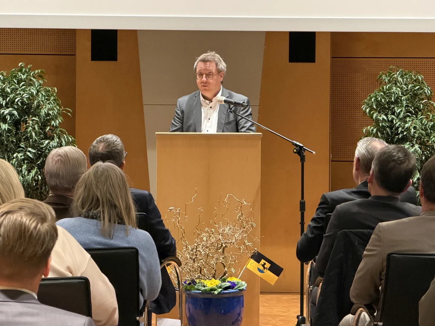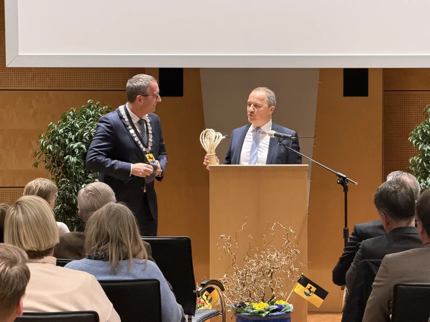 Für den Landkreis Heilbronn überbrachte Landrat Norbert Heuser Grüße. Er freute sich, zahlreiche Bürgermeister aus dem Landkreis, aber auch aus dem benachbarten Neckar-Odenwald-Kreis und dem Rhein-Neckar-Kreis begrüßen zu können. Er betonte, dass es nicht selbstverständlich sei, dass sich jemand findet, der für die 23.000 Einwohner einer Stadt Verantwortung übernehmen wolle. So fänden sich in einigen Orten gar keine Bewerber mehr um das Bürgermeisteramt. Als Präsent für die 2. Amtszeit überbrachte er einen Kompass, der bei der richtigen Orientierung hilft.