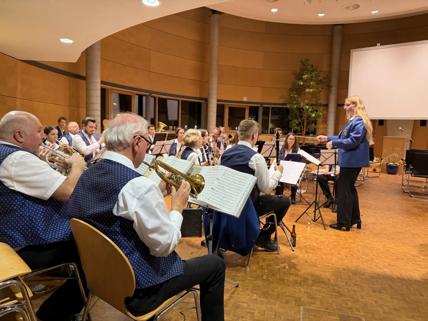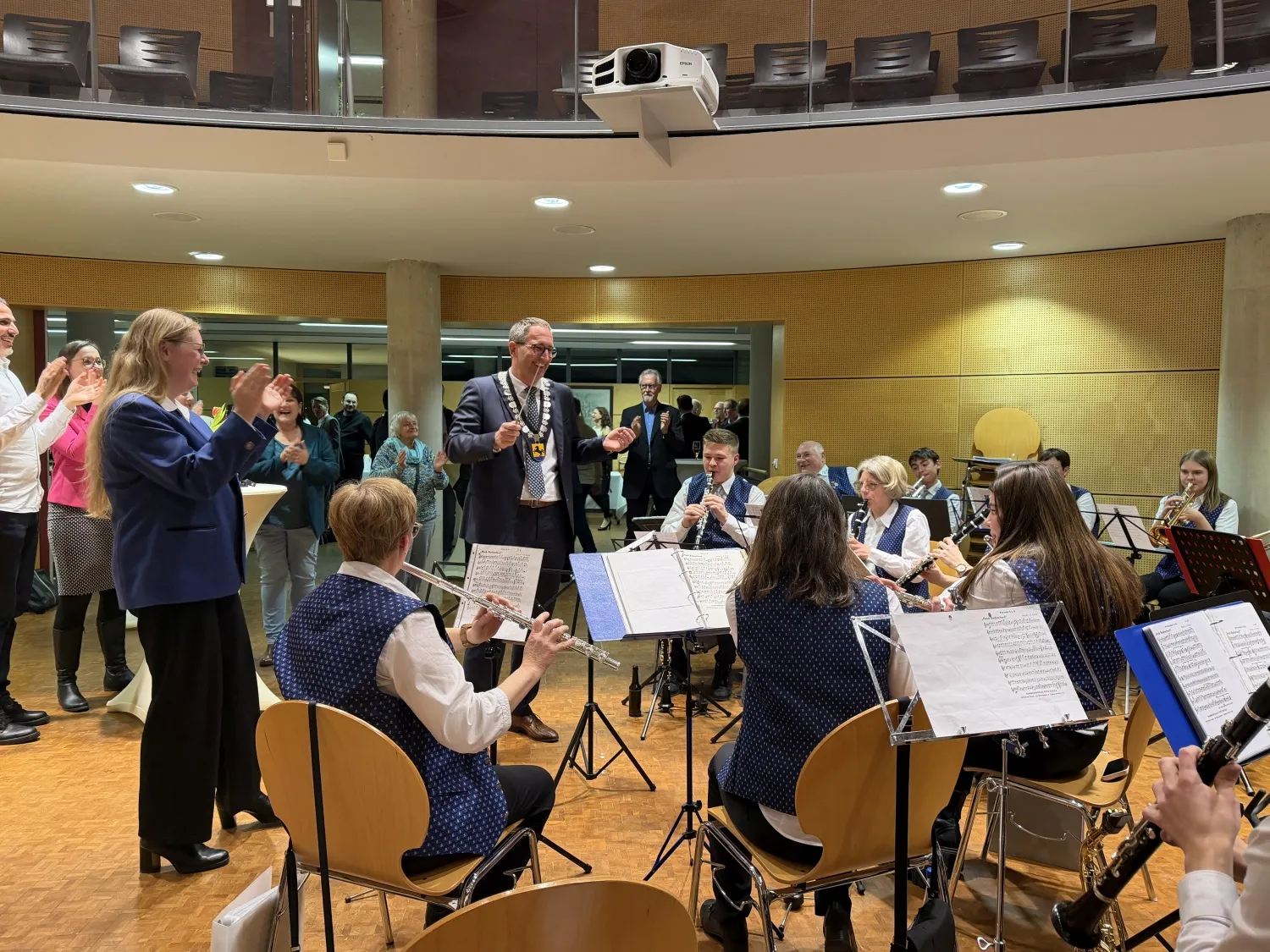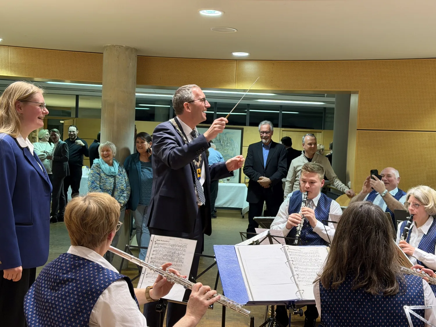 Im Anschluss an die Verpflichtung gab es einen Stehempfang im Foyer, wo die Gäste in guter Stimmung noch lange verweilten. Dazu trug sicher auch die gute Bewirtung durch Kay Nekolny und die musikalische Umrahmung durch den Musikverein Grombach bei. Hier konnte OB Frei auch sein Talent als Dirigent unter Beweis stellen und mit großem Engagement das Badner Lied dirigieren und singen.
