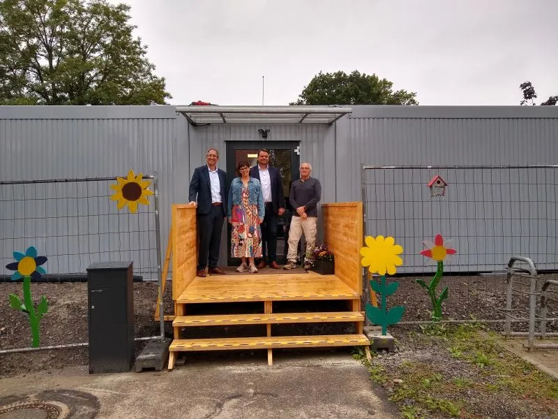 (von links): Oberbürgermeister Sebastian Frei, Schulleiterin Claudia Hauck, Hochbauamtsleiter Alexander Speer und Hochbauamts-Mitarbeiter Achim Gärtner Fleißig gewerkelt wurde in den Sommerferien in Heinsheim, damit die Heinsheimer Grundschulkinder rechtzeitig zum Beginn des neuen Schuljahres die Container neben der Grundschule in Besitz nehmen können. Viel Arbeit hat die Schulleiterin Claudia Hauck in die Einrichtung gesteckt. Überlegungen, welche Materialien wo gelagert werden, mussten angestellt werden.