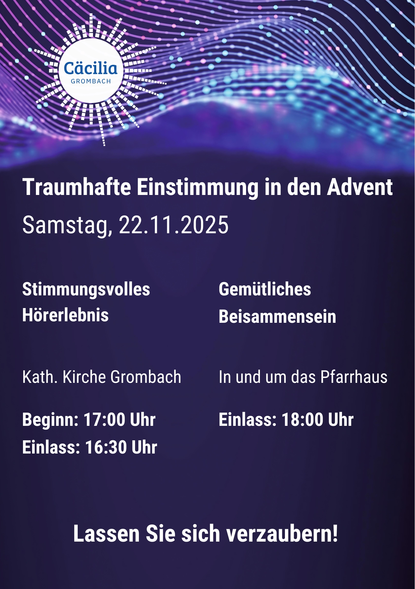 Event im Advent zum 4. Mal, in diesem Jahr unter dem Motto „Traum“. Der Cäcilia-Chor Grombach freut sich bereits auf alle Besucher des diesjährigen Events im Advent, am Samstag, 22.11.2025, um 17:00 Uhr (Kirchenöffnung um 16:30 Uhr), in der katholischen Kirche in Grombach, der Eintritt ist frei, Spenden werden entgegengenommen. Wenn draußen das Licht schwindet und der Winter sich leise ankündigt, lädt der Cäcilia-Chor zu seinem Event ein, um Sie zu berühren und zum Träumen zu bringen und um die Seele zu wärmen.