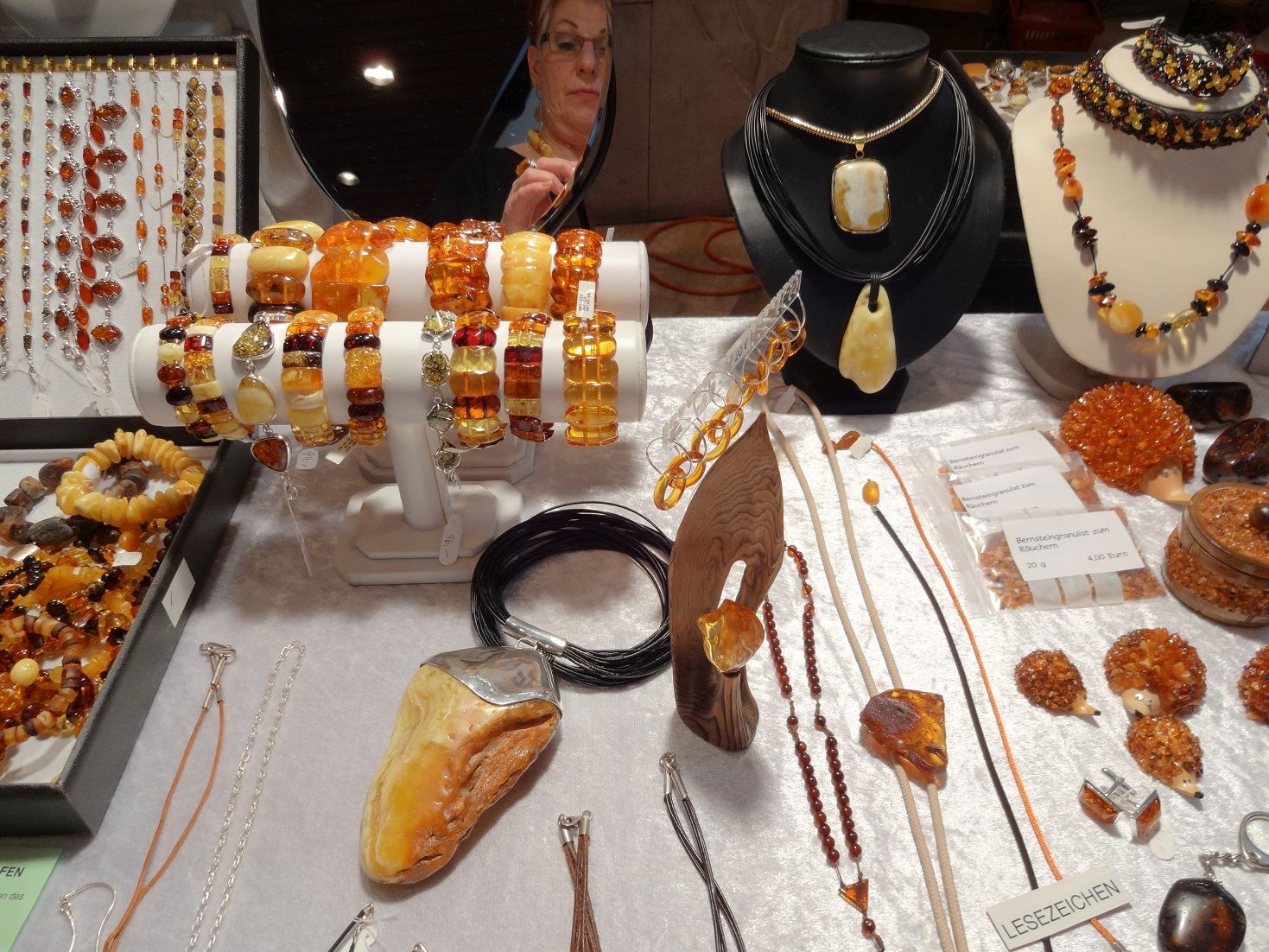 Staunen Sie über die verschiedenen Farbnuancen, über die Transparenz und über die fossilen Einschlüsse in diesen Halbedelsteinen und lassen Sie sich von der Fachfrau erklären, wie man echten von imitiertem Bernstein unterscheiden kann.
