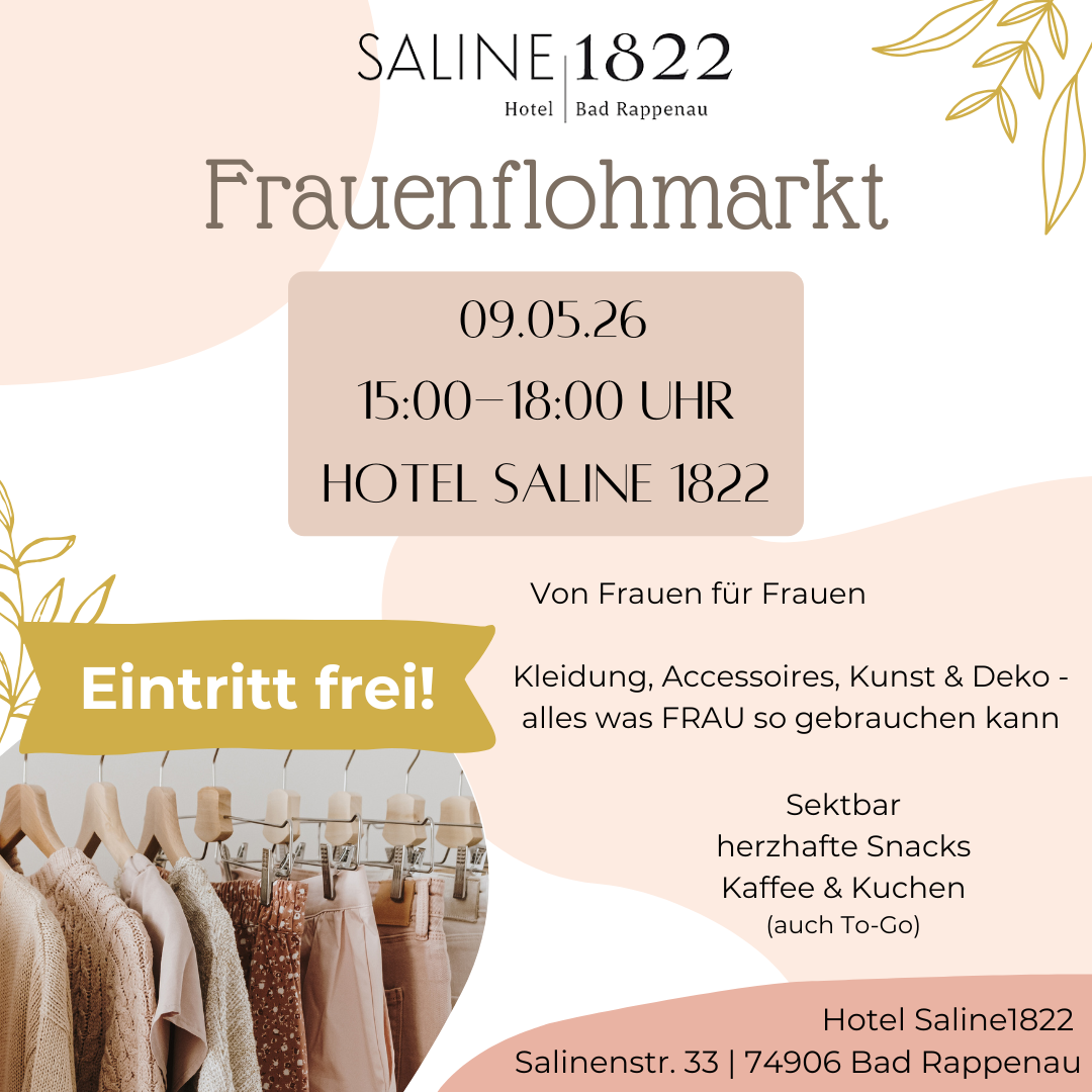 Am Samstag, den 09.05.2026, von 15 bis 18 Uhr verwandelt sich die Saline1822 in Bad Rappenau erneut in ein echtes Paradies für alle Shopping-Liebhaberinnen. Freut euch auf Secondhand-Schätze, Vintage-Lieblinge und nachhaltige Mode, perfekt zum Stöbern!